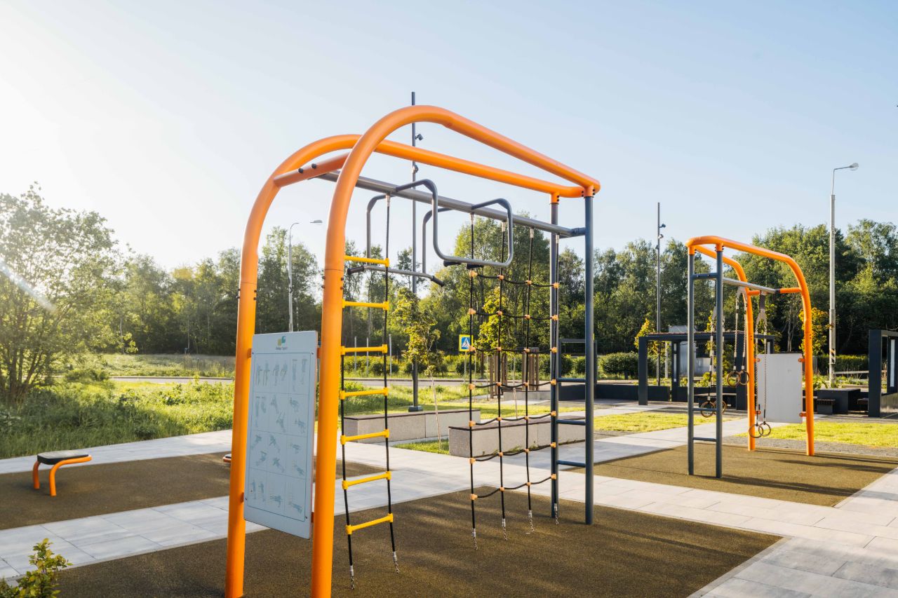 Для поклонников спокойного отдыха рядом с домом есть лаунж-зона с навесом, а любители активного образа жизни оценят воркаут-площадку.