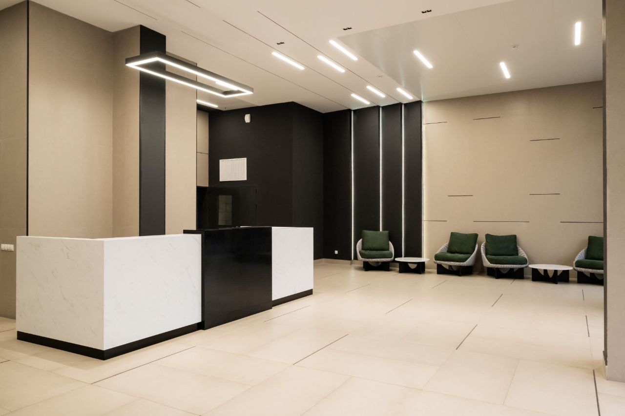 Вход в подъезд расположен на уровне земли. В стильном лобби с мягкой зоной встречает консьерж-сервис, который проводит ваших гостей, курьера и примет доставку с маркетплейса.